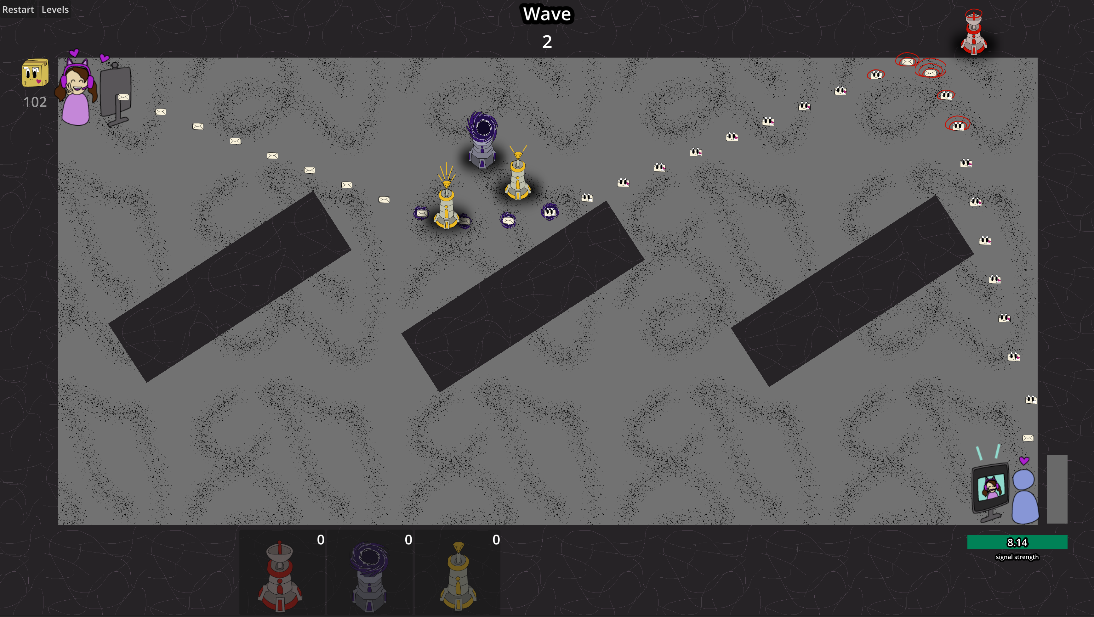 Help "routing" the sent packets from the sender (🙋♀️) to you (👤) by placing a variaty of Towers. The packets come in waves. You need to keep the signal strength above an increasing bar.